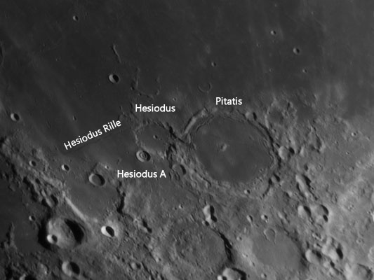 Pitatus、Hesiodus 和 Hesiodus A 雲海的南部有一個97km大的Pitatus隕石坑,左邊是Hesiodus和最特別的Hesiodus A。這個14.5km直徑的坑內有一個圍繞隕坑中心的凸起山脊,但是現在仍未能解釋這個圓形山脊的成因。