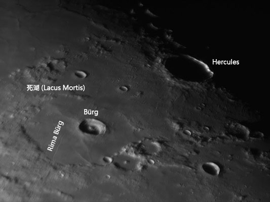 死湖中間有一個比死湖更明顯的小隕石坑Burg,明顯是熔岩上湧後才撞擊在這裡。它的直徑是40km,是一個很典型的複雜坑,有中央山峰。它的西部有一條長100km的月溪,稱為Rima Burg。