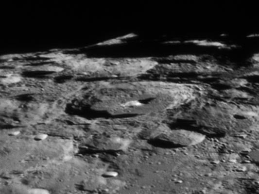 Moretus隕石坑 Moretus位於克拉維斯的南部,非常接近月球的邊緣。因此,我們永遠是由較接近水平的低角度觀察它,如同將要登陸這個隕坑般,別有一番趣味。 Moretus的直徑是115km,比第谷大一半,和第谷一樣是典型複雜坑,有梯級狀坑壁和中央山峰。Moretus的中央山峰是月面眾隕石坑中最高的,超過2km高,容易拍攝。如果Moretus的位置較為正中,則肯定會成為一個更受注目的隕石坑。